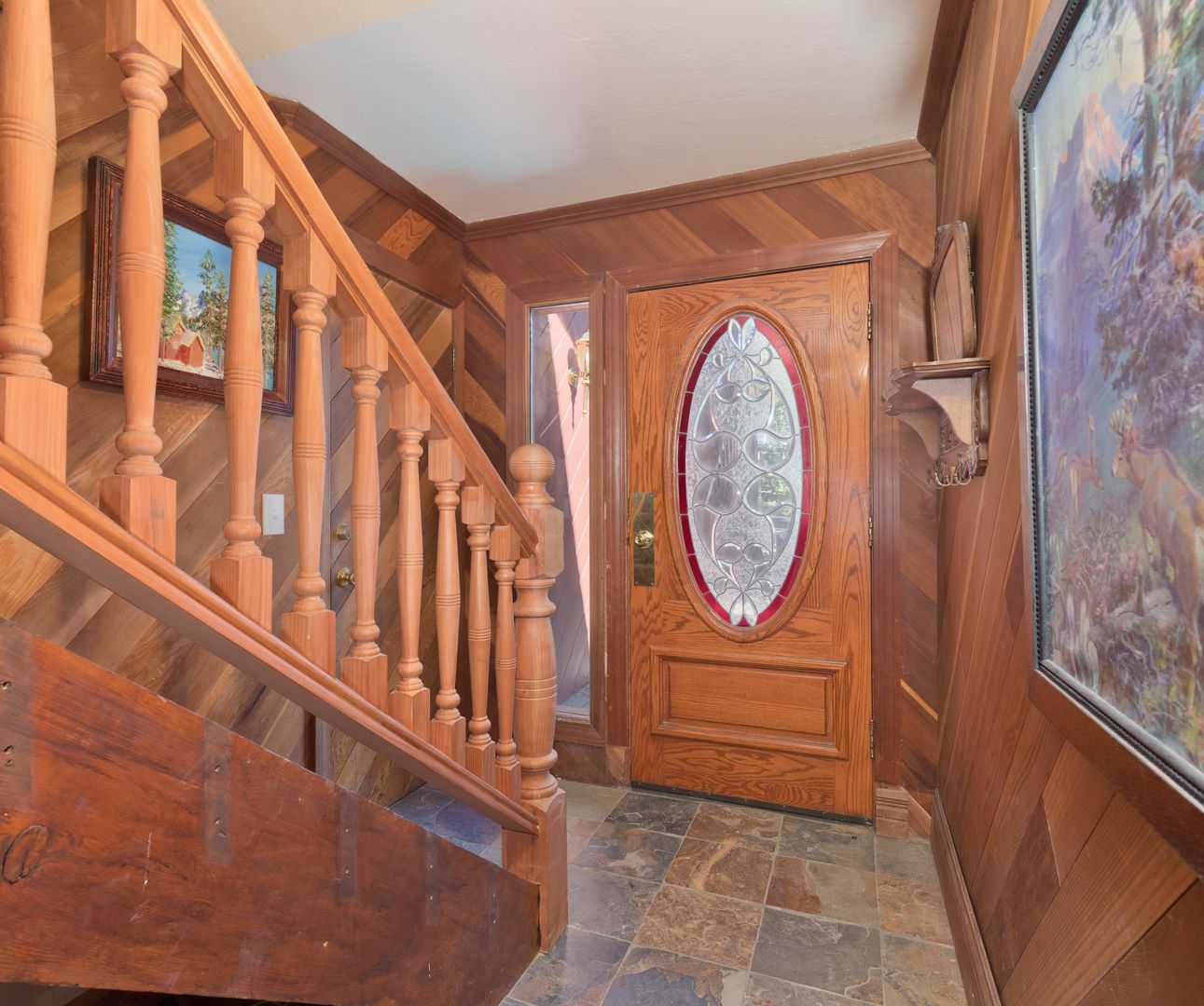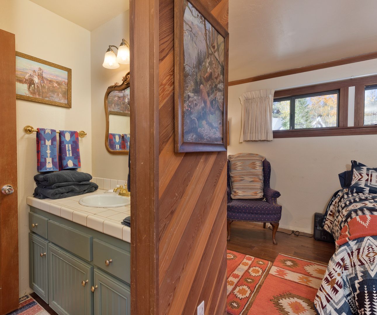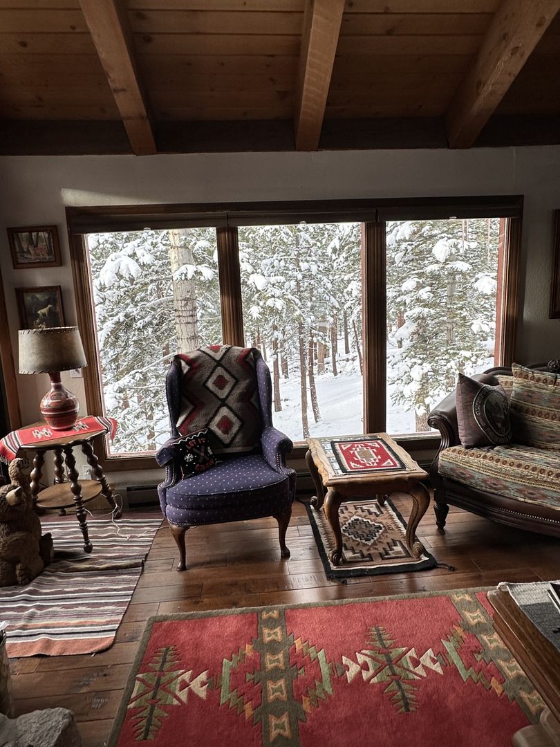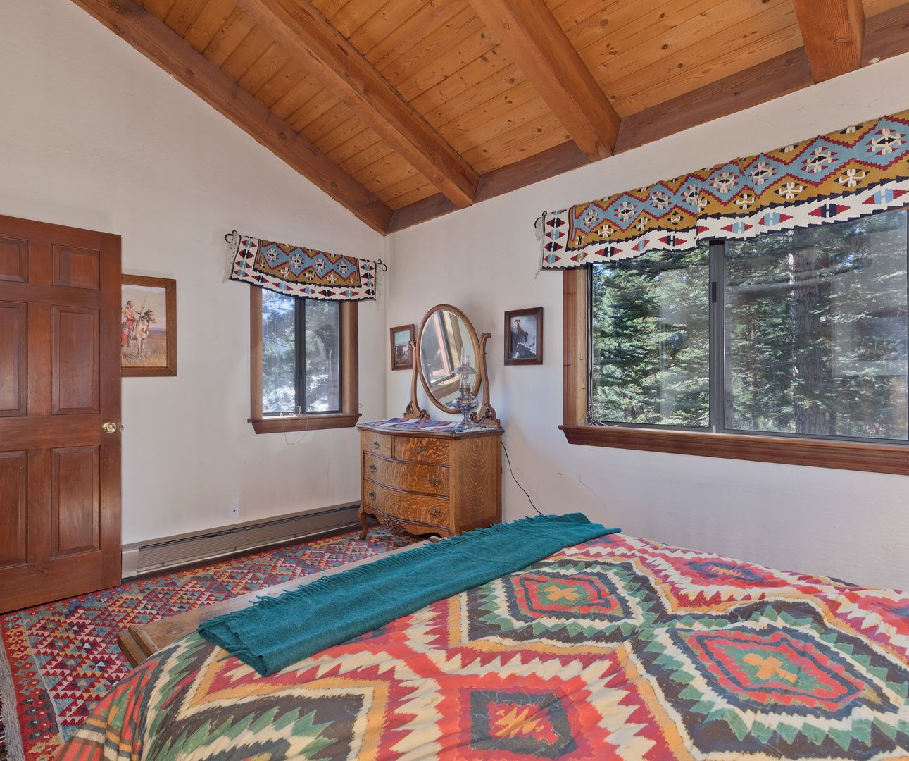 Inside, you’ll find soaring vaulted wood-beam ceilings, large picture windows framing peaceful forest views, and a stone-clad fireplace that anchors the great room. The interior design embraces a distinctive Native-inspired Sierra Nevada mountain motif, featuring richly patterned textiles, handcrafted wood accents, brand new tiled showers, and timeless cabin décor that tells a story in every corner.